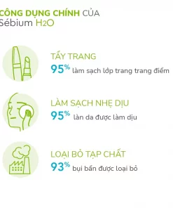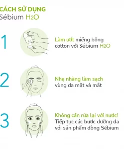 - Sébium H2O là dung dịch làm sạch và tẩy trang chứa hạt micelle tương thích hoàn hảo với làn da, giúp loại bỏ bã nhờn và lớp trang điểm, kể cả những sản phẩm trang điểm chống nước chỉ với 2-3 miếng bông cotton.